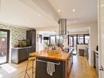 6.0m x 5.07m max (19' 8" x 16' 8") An impressive and stylish living space fitted with a good contemporary range of base and wall units with quartz worksurfaces and drainer, inset bowl &1/4 sink with mixer tap, pull-out larder unit, plumbing for washing machine and dishwasher, designer vertical radiator, large oak topped Island with induction hob and extractor hood over, twin ovens, pull-up power points, integrated wine cooler and spice rack, further radiator and built-in larder cupboard, laminate wood effect flooring, double glazed French style doors and window to the side aspect, a further set of doors to the rear garden and a part double glazed door to the conservatory, recessed lighting to the ceiling.
