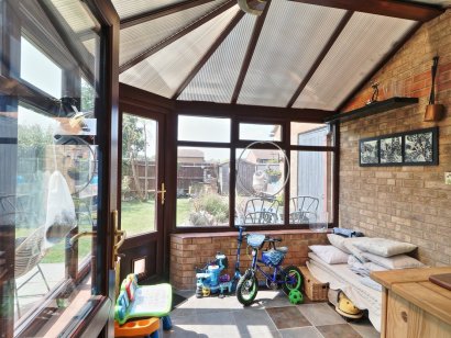 2.65m x 2.55m (8' 8" x 8' 4") Part brick and UPVC double gazed with a Victorian style roof, ceramic tiled floor, power points, door on to the rear garden and a door to the garage.