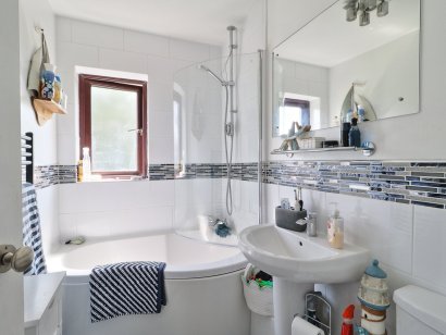 Three piece white suite incorporating a modern shower bath with 'Aqualisa' shower and screen, wash hand basin and WC, tiling to half height, double glazed window, heated towel rail and a tiled floor.
