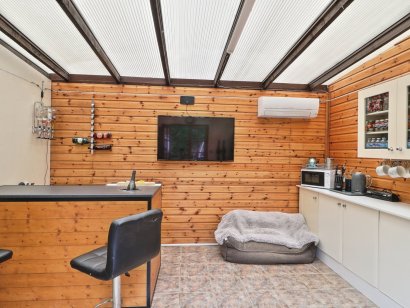 4.07m x 3.73m (13' 4" x 12' 3") Ceramic tiled floor, air conditioning, wall mounted TV connections, fitted storage, power and lighting, glazed roof and double doors on to the rear garden.